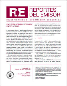 El Departamento Técnico y de Información Económica presenta los principales resultados de la Encuesta de expectativas económicas, que se aplicó en enero de 2015 a funcionarios de primer nivel de diferentes empresas del sector productivo, así como a académicos y consultores, en las cuatro principales ciudades de Colombia (Bogotá, Medellín, Cali y Barranquilla). Para su elaboración se utilizó la información disponible más reciente de varios indicadores: inflación, tasas de interés, tasa de cambio nominal, desempleo y crecimiento económico, con el fin de conocer las expectativas de estas y otras variables monetarias y reales durante el transcurso de 2015 y 2016.