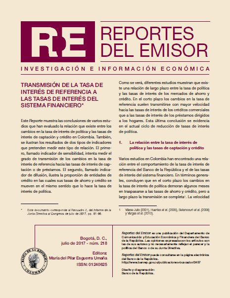Este Reporte muestra las conclusiones de varios estudios que han evaluado la relación que existe entre los cambios en la tasa de interés de política y las tasas de interés de captación y crédito en Colombia. También, se ilustran los resultados de dos tipos de indicadores que pretenden medir este tipo de relación. El primero, llamado indicador de sensibilidad, intenta medir el grado de transmisión de los cambios en la tasa de interés de referencia hacia las tasas de interés de captación o de préstamos. El segundo, llamado indicador de difusión, ilustra la proporción de entidades de crédito en las cuales sus tasas de ahorro y crédito se mueven en el mismo sentido que lo hace la tasa de interés de política.