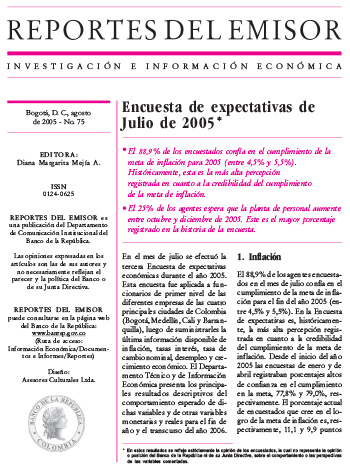 - El 88,9% de los encuestados confía en el cumplimiento de la meta de inflación para 2005 (entre 4,5% y 5,5%). Históricamente, esta es la más alta percepción registrada en cuanto a la credibilidad del cumplimiento de la meta de inflación.