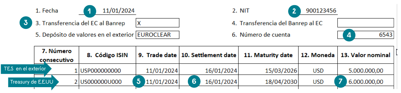 El anexo 10A solo se diligencia para los títulos emitidos en el exterior, incluidos los emitidos por la Nación (Colombia) en el exterior. En este caso, se diligencia para el TES emitido en el exterior y para el bono emitido por el gobierno de EE. UU. (Treasury).