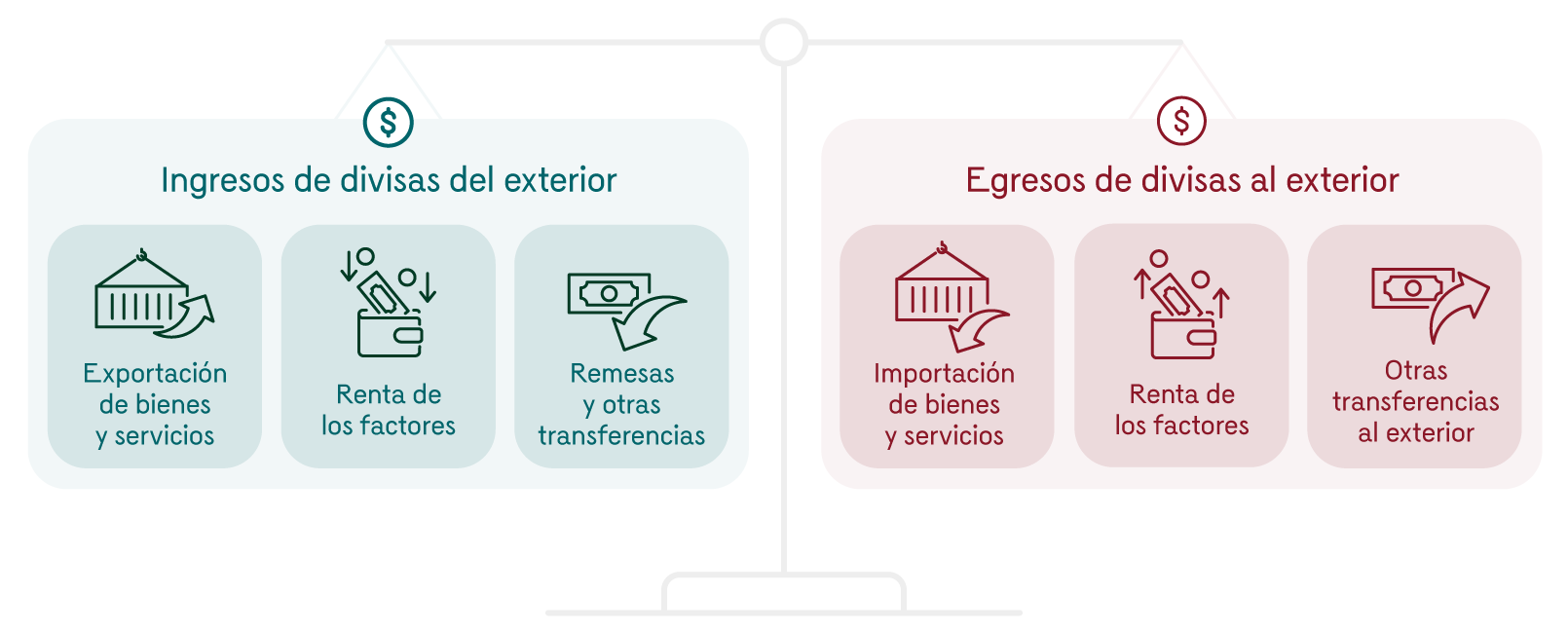 - Como la diferencia (resta) entre los ingresos de divisas del exterior (que incluyen las exportaciones de bienes y servicios, la renta de los factores, las remesas de los trabajadores) y los egresos de divisas al exterior (que incluyen las importaciones de bienes y servicios, la renta de los factores y otras transferencias al exterior).