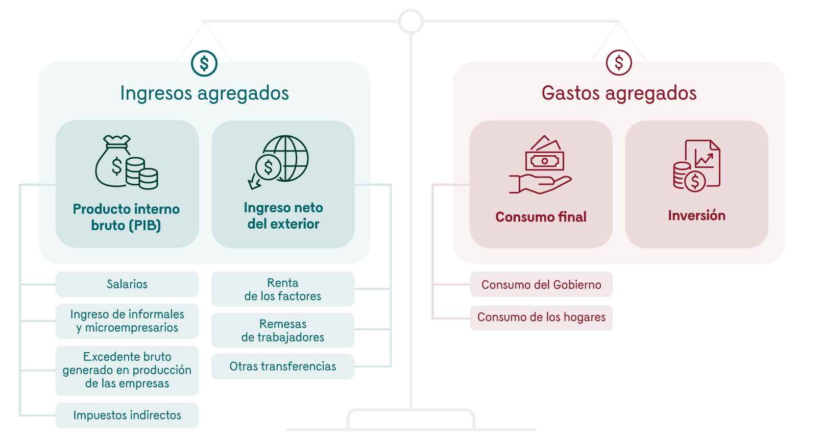 - Como la diferencia (resta) entre los ingresos y los gastos agregados de la economía. Los ingresos incluyen el producto interno bruto (salarios + ingreso de los informales y microempresarios + excedente bruto generado en la producción de las empresas + impuestos indirectos) y los ingresos netos del exterior por renta de los factores (intereses, arrendamientos y dividendos), remesas de los trabajadores y otras transferencias. Los gastos agregados incluyen el consumo (de hogares y Gobierno) y la inversión. Vale la pena mencionar que los ingresos menos el consumo total equivalen al ahorro de la economía, razón por la cual esta diferencia también puede leerse como el balance entre el ahorro y la inversión.