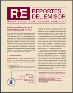 La variación anual del índice de precios al consumidor (IPC) nacional fue de 3,18% en 2018, ubicándose muy cerca de la meta del 3%. Este comportamiento no es homogéneo en el grupo de ciudades y categorías de gasto establecidos por el Departamento Administrativo Nacional de Estadística (DANE) en el cálculo del IPC. Conviene, por tanto, revisar las tendencias observadas en las ciudades y grupos de gasto. Este es, precisamente, el propósito de este Reportes, donde se describe este comportamiento en las veinticuatro ciudades incluidas en la muestra y en las distintas categorías de gasto que permite la metodología de cálculo.
