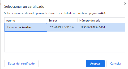 Tercero: Seleccionar el certificado a validar. En caso de que el navegador no solicite el certificado, avance al Segundo paso: Notificar.