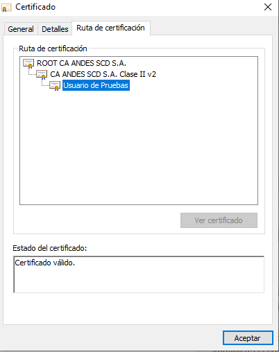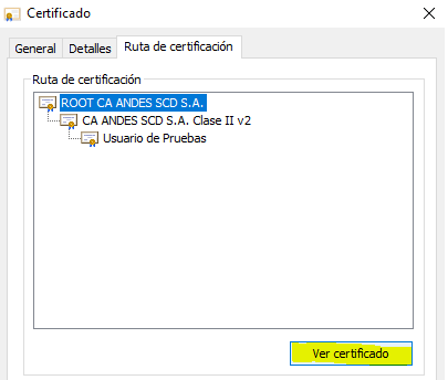 1. Seleccionar el segundo nodo en el árbol de ruta de certificación y seleccionar “Ver Certificado”: