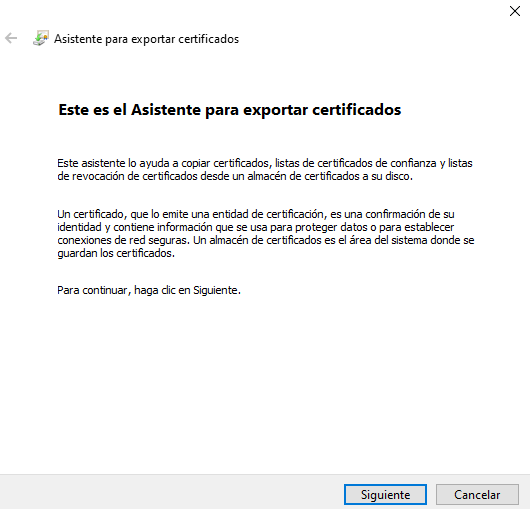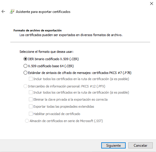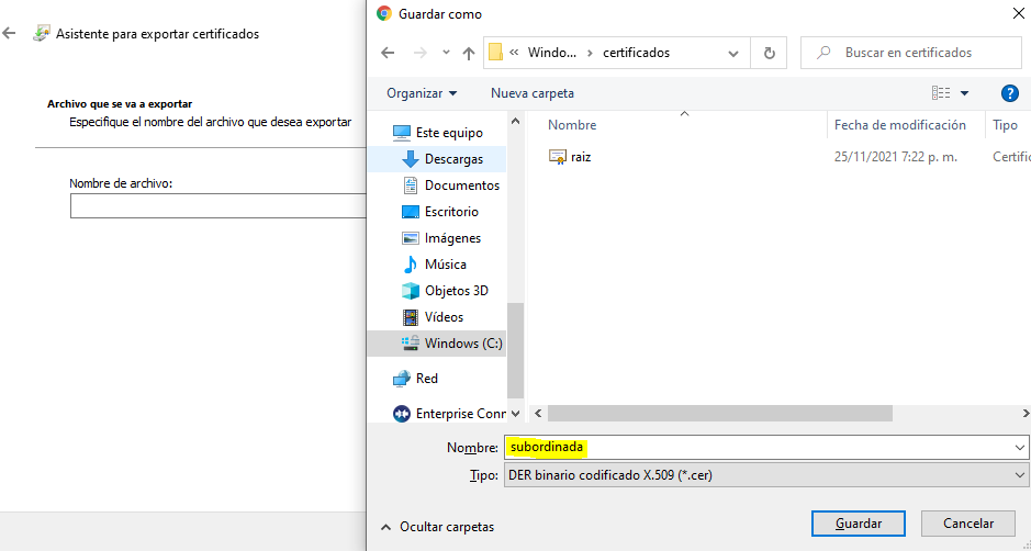 Parte B: Exportar la subordinada, en esta parte se debe repetir el proceso para el segundo nodo del árbol de certificación.