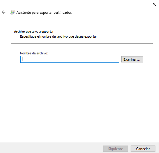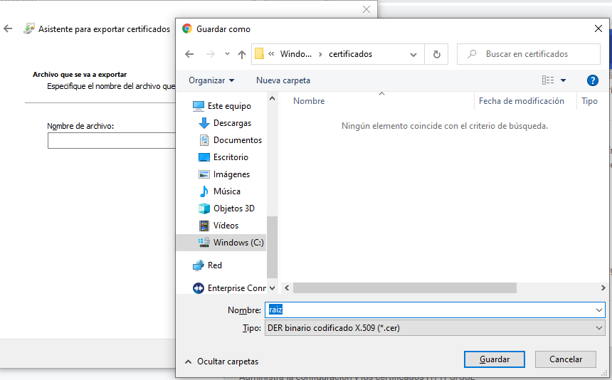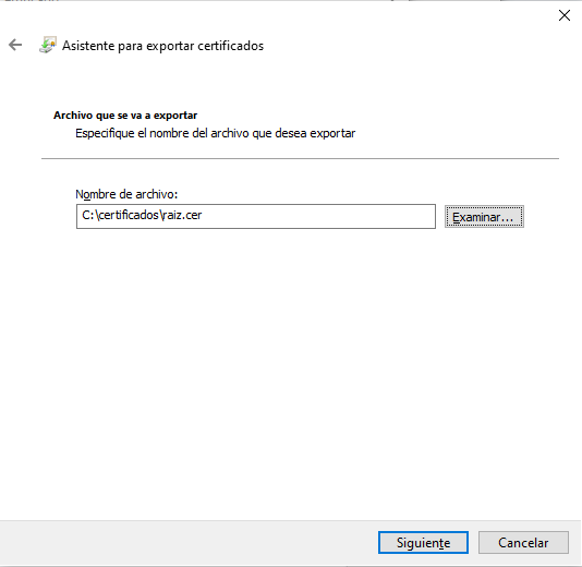 En la siguiente opción, clic en “Examinar”, en esta parte el usuario deberá seleccionar una carpeta para ubicar el archivo y definirle un nombre, para una correcta identificación se espera que este certificado se nombre cómo "raíz" o "root". “Guardar”.