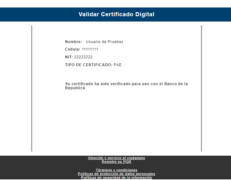 En el caso de validación correcta el sistema mostrará en pantalla la información del certificado cómo se muestra a continuación, en este caso el certificado se encuentra homologado para su uso en modo de autenticación.