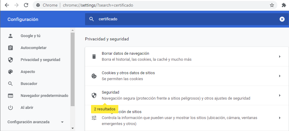 Tercero: En la barra “Buscar ajustes” digitar “certificado”, en el resultado de búsqueda seleccionar la opción “Seguridad”