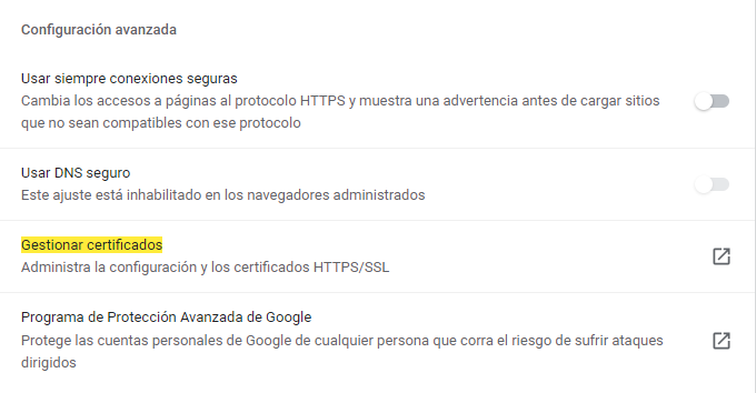 Dentro de la opción de seguridad, desplazar hacía la parte inferior en busca de la opción “Gestionar certificados”