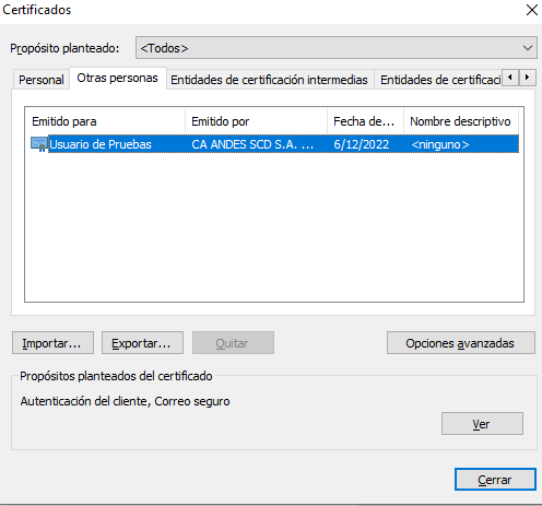 Cuarto: Seleccionar el certificado sobre el cual se desea realizar la opción de homologación, para el caso explicativo se selecciona el mismo certificado usado previamente. Para seleccionarlo se debe ejecutar un doble clic sobre el certificado, esto despliega una nueva ventana específica para el certificado.