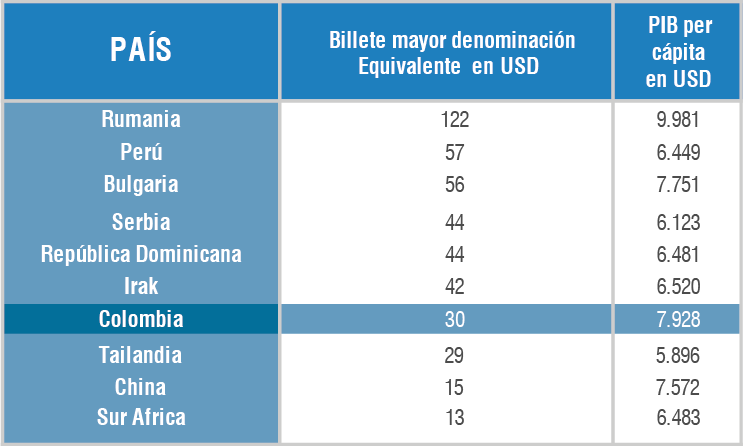De otra parte, es útil también recordar que el valor de este billete expresado en dólares (aproximadamente US$30), es inferior al de un gran número de países, incluyendo el de economías que tienen un PIB per cápita similar al de Colombia, y está en niveles muy similares a los billetes de otras economías de la región y bastante por debajo de los de países desarrollados.