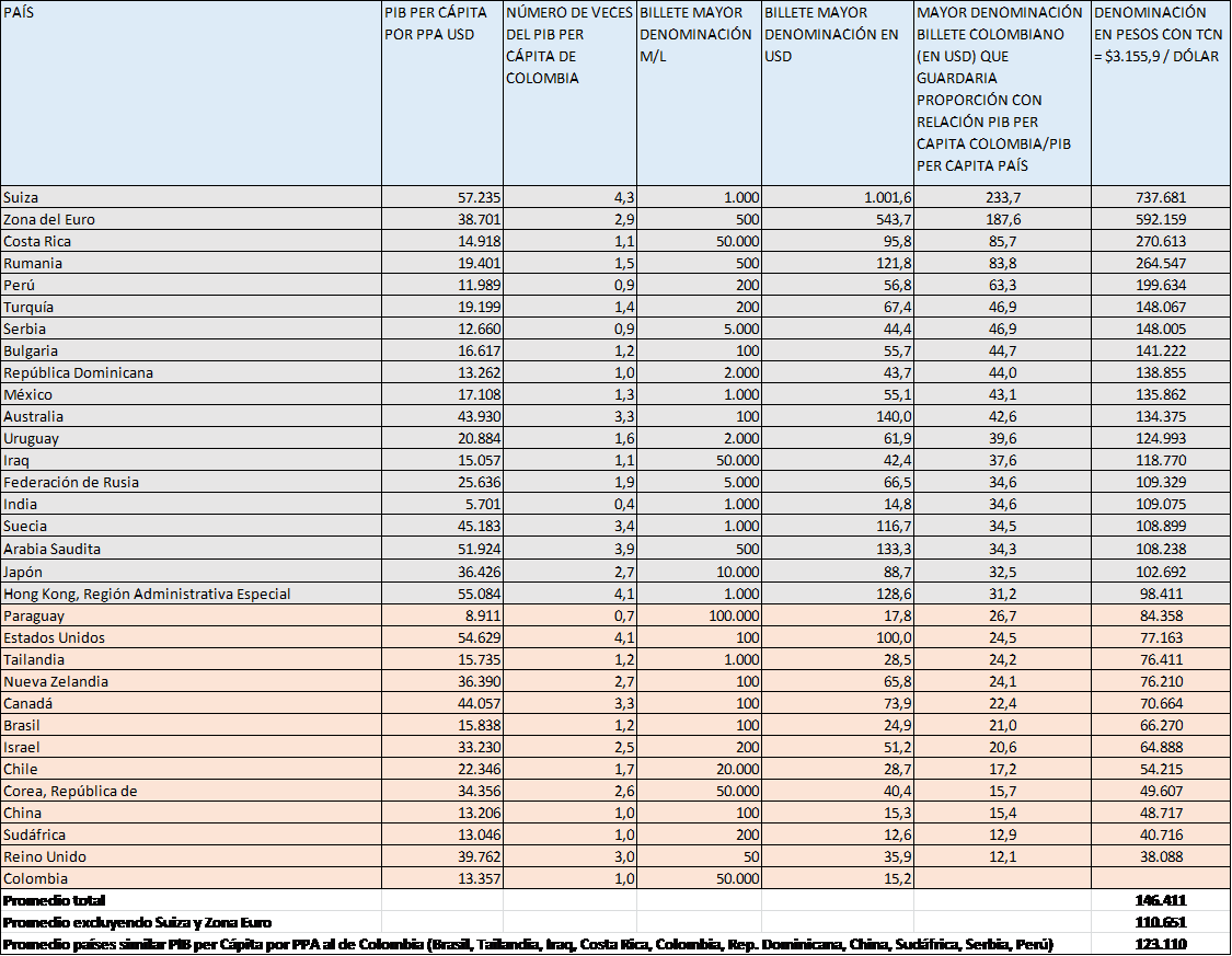 Al comparar el PIB per cápita frente al billete de la más alta denominación para una muestra de 32 países, que incluye industrializados y de similar PIB per cápita al de Colombia, se encontró que, en promedio, el billete de mayor denominación equivalente para el país sería: i) considerando los 32 países, $146 mil; ii) si se excluyen los países con mayor denominación (Suiza y Zona Euro), $110 mil; y iii) Si tomamos el promedio de países con similar PIB per cápita al de Colombia, $132 mil.