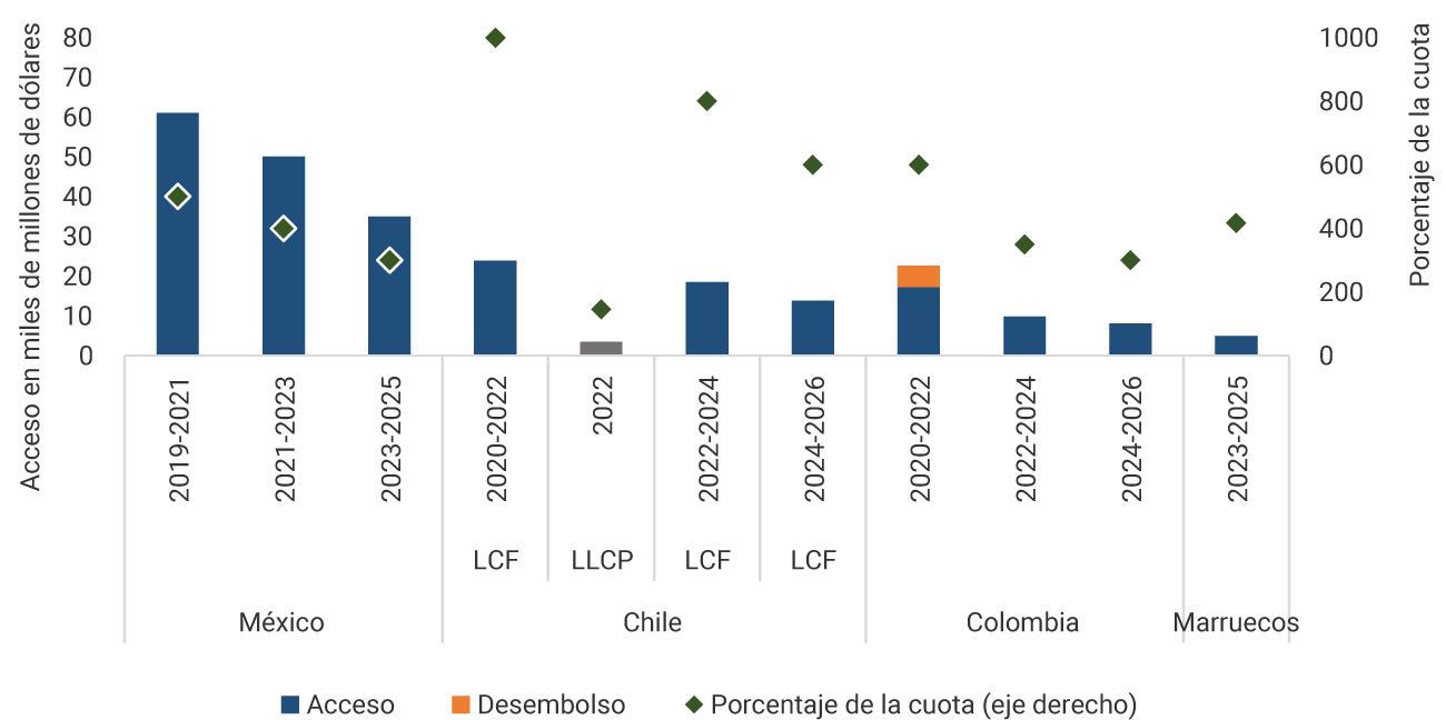 La LCF opera como una línea de crédito renovable que, a discreción del país, puede usarse inicialmente por uno o dos años, y para la que se evalúa el derecho de acceso al cabo del primer año. No cuenta con un máximo establecido y el acceso se establece en relación con el tamaño de la cuota del país en el FMI2, el cual puede ser incrementado durante la vigencia del acuerdo, siempre que el país cumpla con los criterios de calificación. Los recursos de esta línea están destinados exclusivamente para atender situaciones críticas de la balanza de pagos.