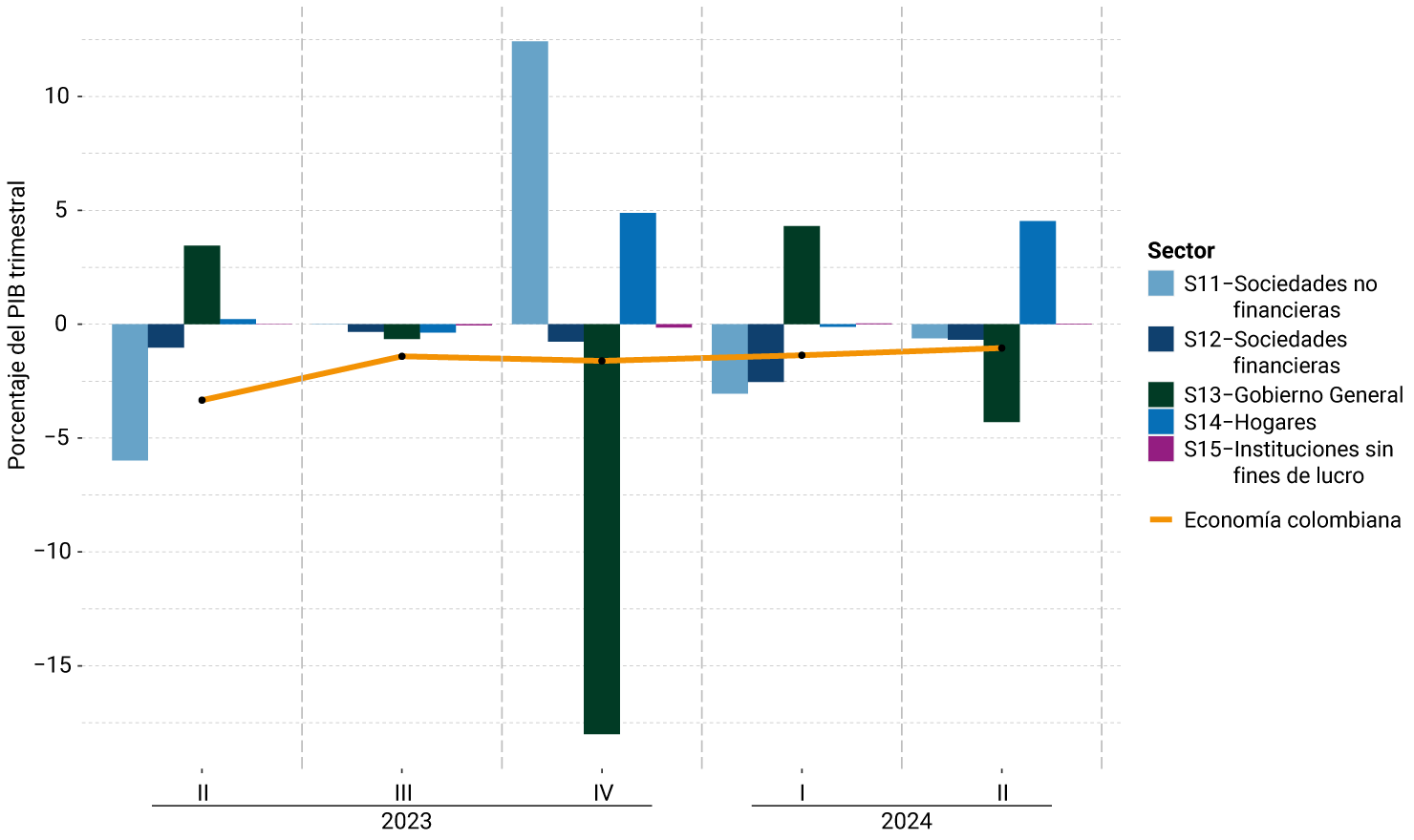 De acuerdo con las cuentas financieras calculadas por el Banco de la República, en el segundo trimestre de 2024, el déficit en cuenta corriente de la economía colombiana alcanzó el 1,0 % del producto interno bruto (PIB) trimestral, frente al 3,3 % del mismo periodo del año 2023. Lo anterior es explicado principalmente por los déficits del Gobierno General (4,3 %) y las sociedades no financieras (0,7 %).