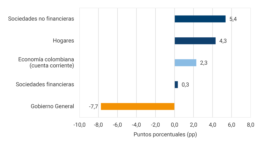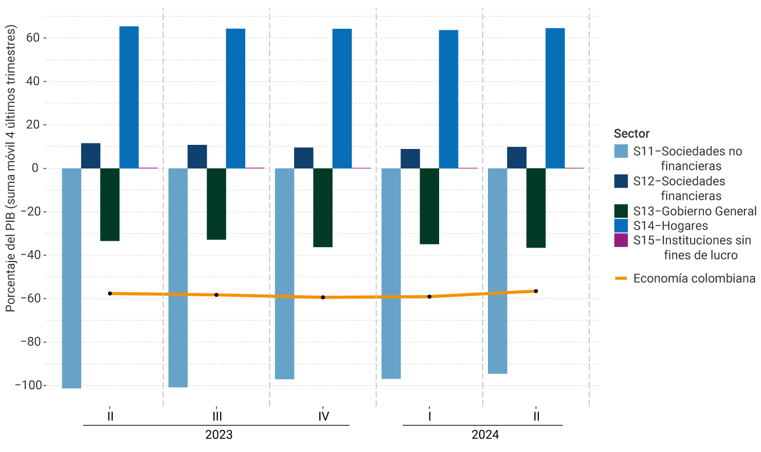 Al final del segundo trimestre del 2024, la economía colombiana registró una posición deudora neta con el resto del mundo equivalente al -56,5 % del PIB anual. Esta es explicada por la posición deudora neta de las sociedades no financieras (-94,6 %) y del Gobierno General (-36,6 %). Lo anterior fue parcialmente compensado por las posiciones acreedoras netas de los hogares (64,6 %) y las sociedades financieras (9,8 %).