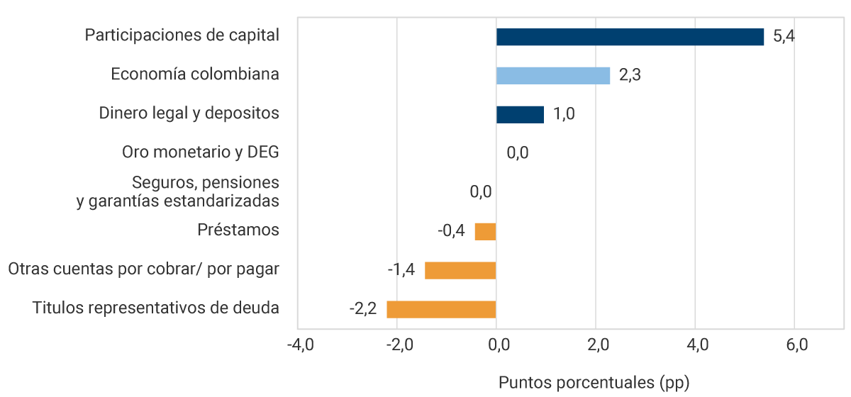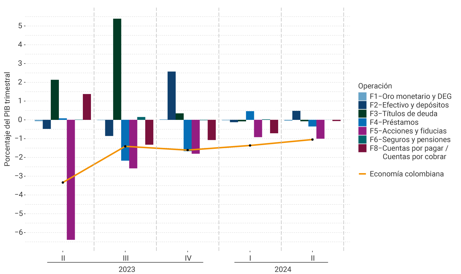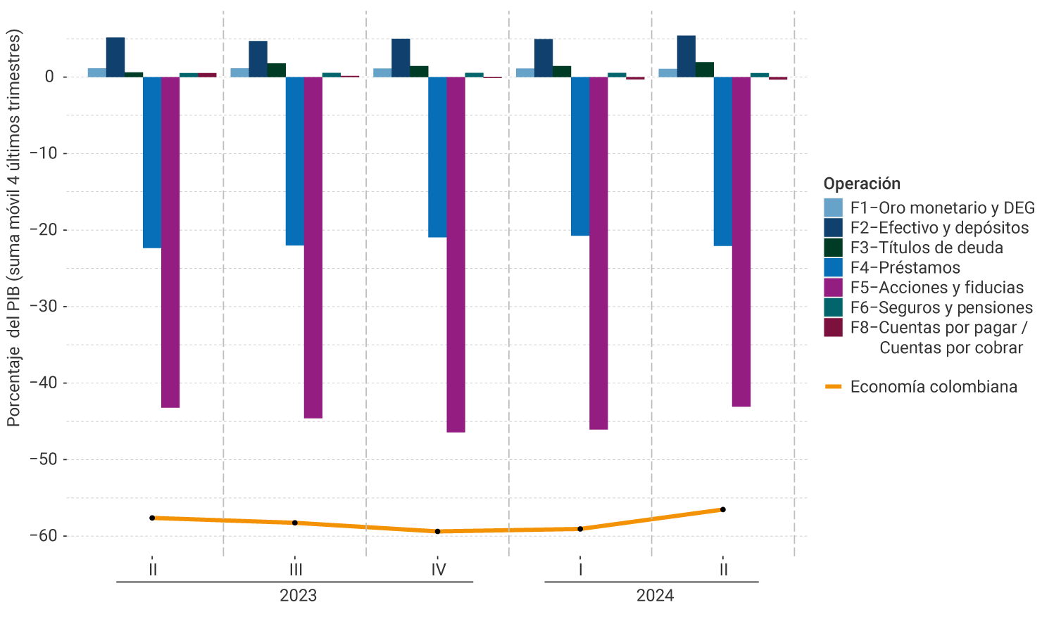 Al final del segundo trimestre de 2024, la posición deudora neta de la economía colombiana con el resto del mundo equivalente al -56,5 % estuvo principalmente representada por participaciones de capital (F5) de -43,1 % y préstamos (F4) de -22,1 % del PIB anual. Lo anterior fue parcialmente compensado por las tenencias en el exterior de los colombianos de efectivo y depósitos (F2) y de títulos de deuda (F3) de 5,4 % y 1,9 %, respectivamente.