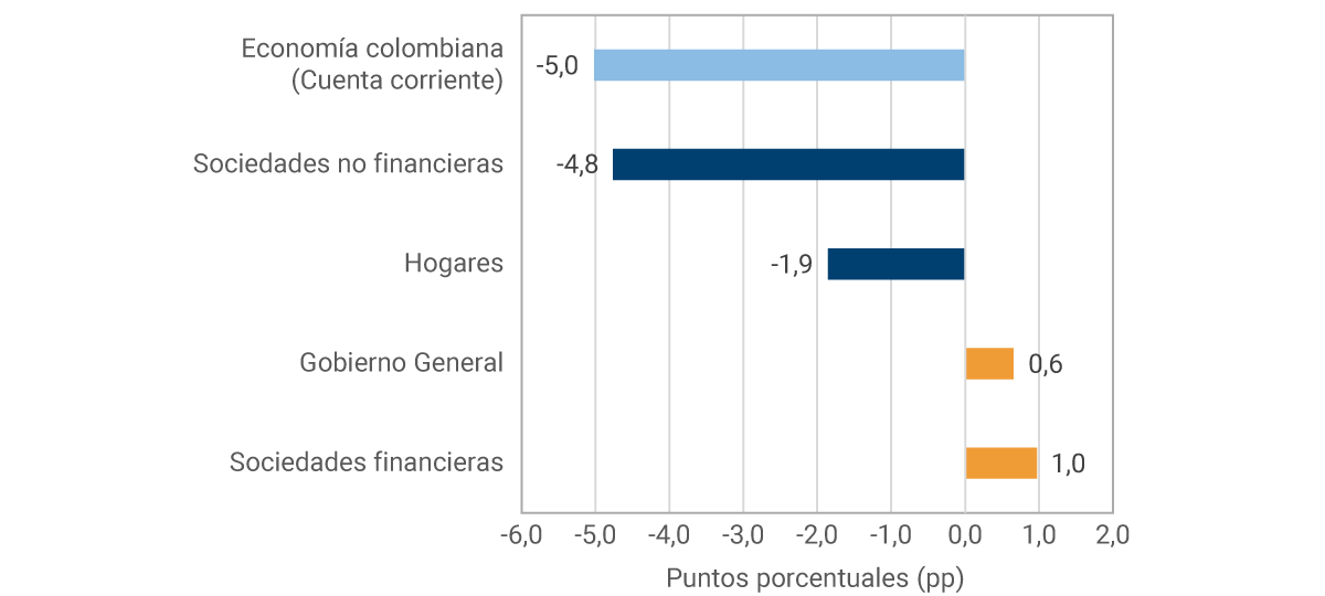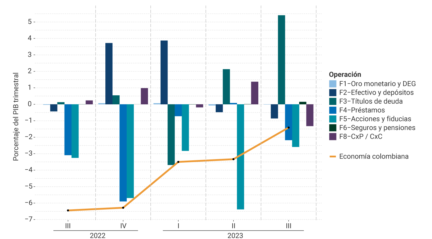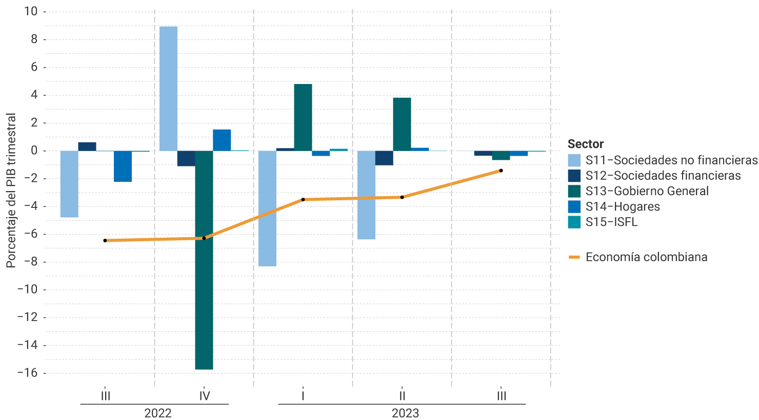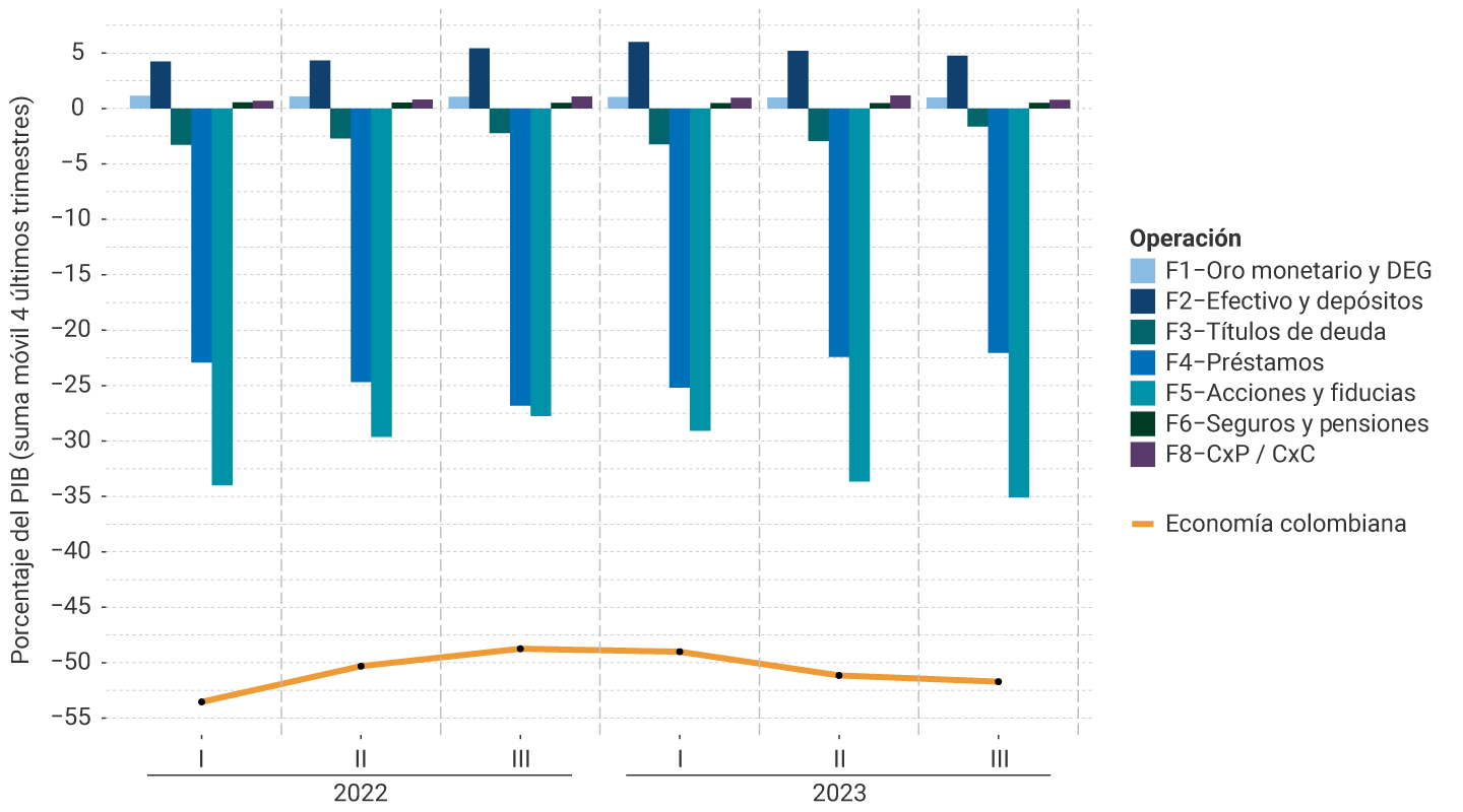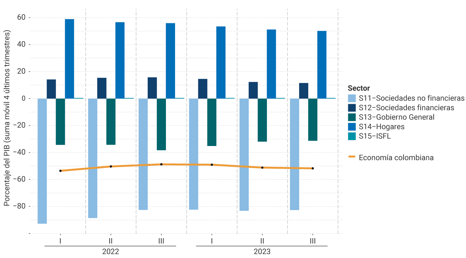 Al final del tercer trimestre del 2023, la economía colombiana registró una posición deudora neta con el resto del mundo equivalente al -51,7 % del PIB anual. Esta es explicada por la posición deudora neta de las Sociedades No Financieras (-82,6 %) y del Gobierno General (-31,2 %). Lo anterior fue parcialmente compensado por las posiciones acreedoras netas de los Hogares (50,1 %) y las Sociedades Financieras (11,6 %).
