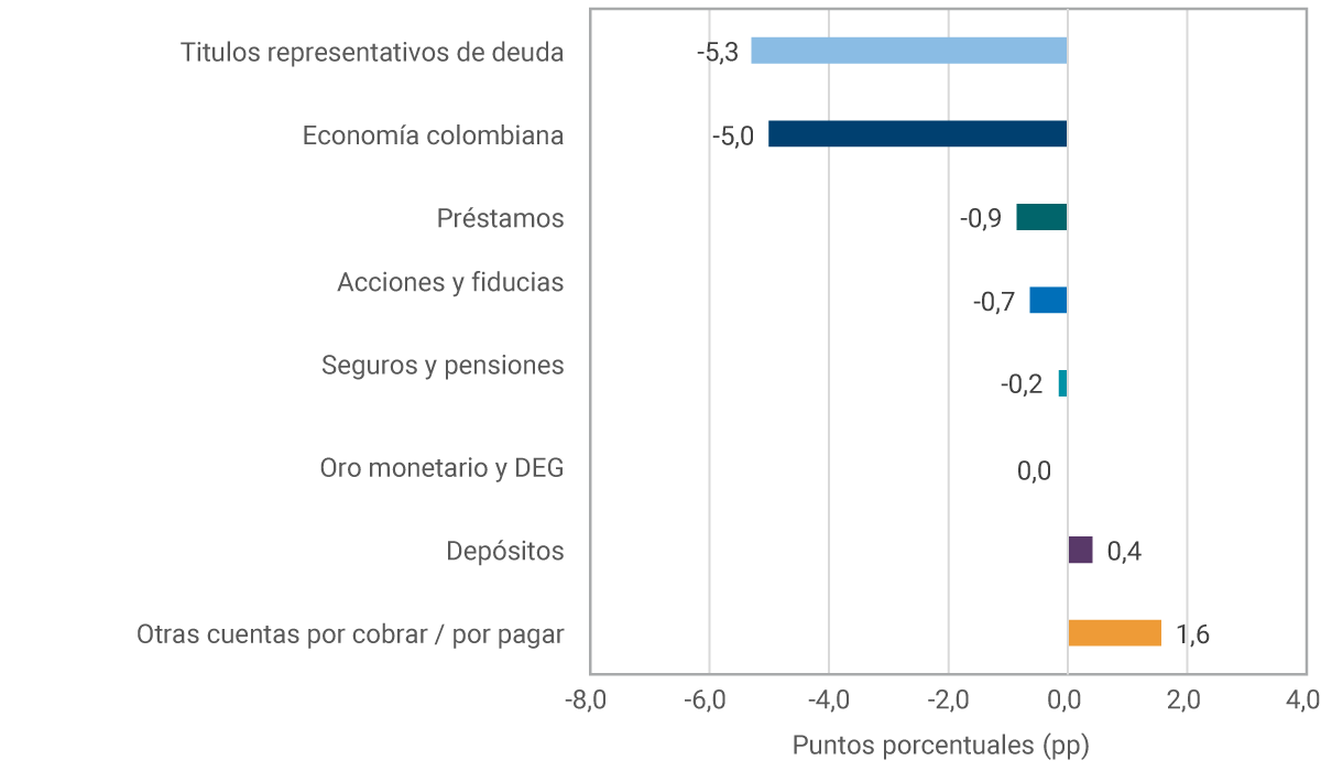 Al final del tercer trimestre de 2023, la posición deudora neta de la economía colombiana con el resto del mundo estuvo principalmente representada en participaciones de capital (F5) de -35,1 % y Préstamos (F4) de -22,0 % del PIB anual. Lo anterior fue parcialmente compensado por las tenencias en el exterior de los colombianos de Efectivo y depósitos (F2) de 4,8 % y de Cuentas por cobrar o pagar netas (F8) de 0,8 %.