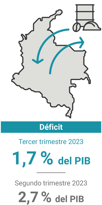La cuenta corriente de la balanza de pagos de Colombia, durante el tercer trimestre de 2023, registró un déficit de USD 1.680 millones (m), equivalente al 1,7 % del producto interno bruto (PIB) trimestral. Por su parte, la cuenta financiera, incluyendo la variación de activos de reserva (US 457 m), registró entradas netas de capital por USD 1.387 m (1,4 % del PIB trimestral). Los errores y omisiones se estimaron en USD 293 m.