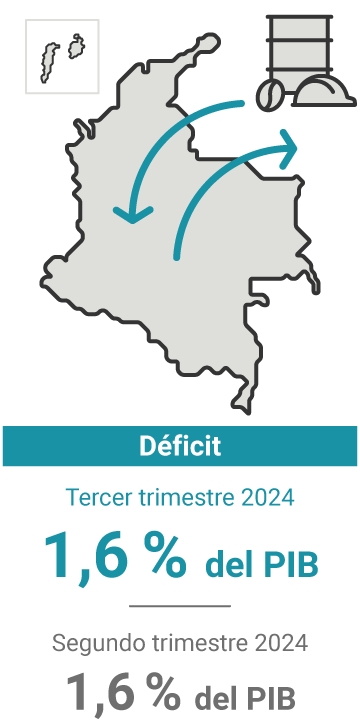 La cuenta corriente de la balanza de pagos de Colombia, durante el tercer trimestre de 2024, registró un déficit de USD 1.669 millones (m), equivalente al 1,6 % del producto interno bruto (PIB) trimestral. Por su parte, la cuenta financiera, incluyendo la variación de activos de reserva (USD 1.046 m), registró entradas netas de capital por USD 981 m (0,9 % del PIB trimestral). Los errores y omisiones se estimaron en USD 688 m.