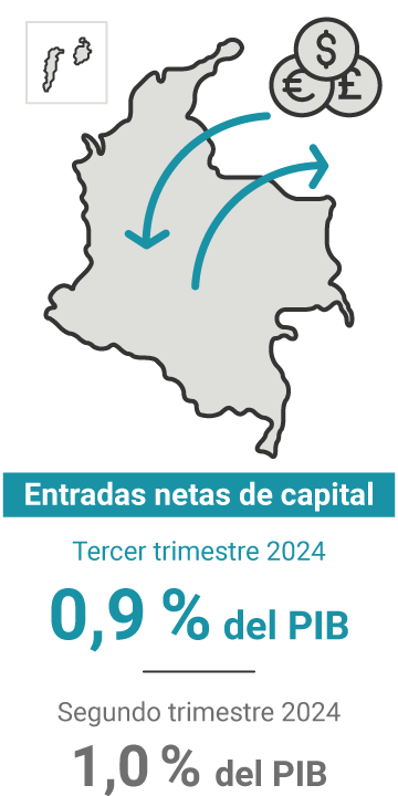 Las entradas netas de capital de USD 981 m (0,9 % del PIB) registradas en la cuenta financiera durante el tercer trimestre de 2024 se redujeron en USD 89 m con relación al trimestre inmediatamente anterior. Este resultado se explica principalmente por desinversiones extranjeras de cartera, menor constitución de activos en el exterior, y mayor acumulación de activos de reservas; lo cual fue compensado parcialmente por mayores desembolsos netos de préstamos y otros créditos externos y los mayores ingresos de inversión extranjera directa.