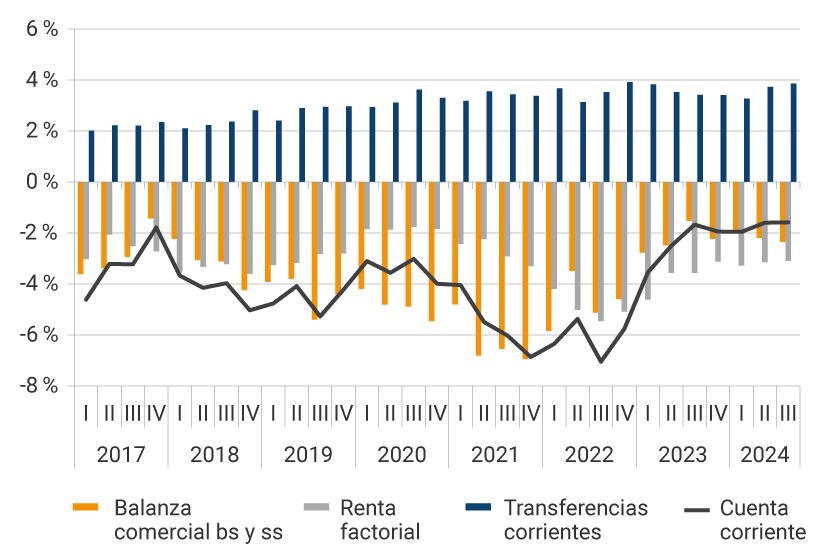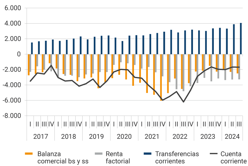 Por componentes, el déficit en la cuenta corriente (USD 1.669 m) del tercer trimestre de 2024 se origina por los egresos netos de renta de los factores por valor de USD 3.262 m, y por los balances deficitarios del comercio exterior de bienes de USD 2.357 m, y del comercio de servicios por USD 124 m. Estos resultados fueron compensados parcialmente por los ingresos netos de transferencias corrientes de USD 4.073 m (Gráfico 1).