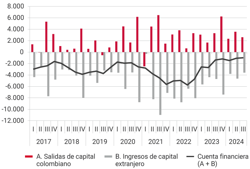 En la cuenta financiera para el tercer trimestre de 2024, se estiman entradas netas de capital por USD 981 m que corresponden a ingresos de capital extranjero (USD 3.870 m), salidas de capital colombiano (USD 1.561 m), pagos de residentes a no residentes por perdidas en operaciones de derivados financieros (USD 282 m), y al aumento de las reservas internacionales por concepto de transacciones de balanza de pagos (USD 1.046 m) (Gráfico 2).