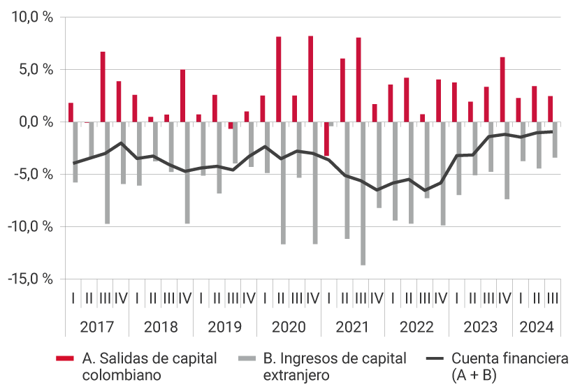 Durante los primeros nueve meses de 2024, comparado con igual periodo de 2023, la cuenta financiera (USD 3.519 m, 1,1 % del PIB) presentó menores entradas netas por USD 3.146 m, dinámica que se explica principalmente por menores ingresos netos de inversión extranjera directa y mayores egresos netos para constituir inversión directa de Colombia en el exterior, así como por la mayor acumulación de activos de reserva. Estos flujos son compensados parcialmente por la menor constitución de activos en el exterior y los mayores pasivos por inversión extranjera de cartera.