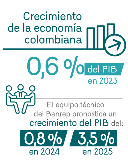 - Según la información del DANE, el crecimiento de la economía colombiana en 2023 fue del 0,6 %, el cual resultó inferior a todos los pronósticos, una desaceleración ocasionada por una combinación de factores, después de registrar crecimientos históricamente altos en 2021 (10,7 %) y 2022 (7,3 %), que llevaron el producto interno bruto (PIB) a niveles superiores a los registrados antes de la pandemia.