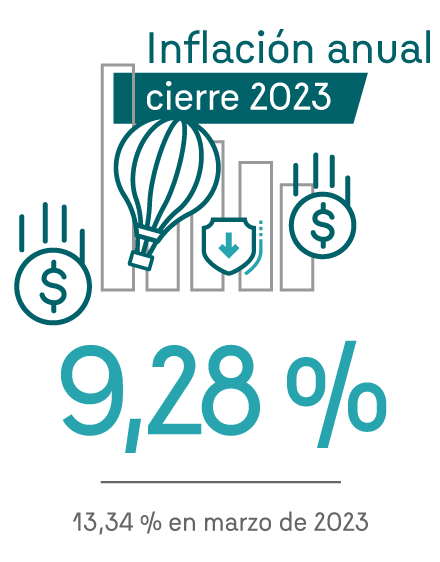 - La inflación anual de precios al consumidor en Colombia alcanzó un pico del 13,34 % en marzo de 2023, y a partir de abril inició una senda decreciente, hasta llegar a un nivel del 9,28 % al cierre de 2023. Con ello, la tasa de inflación anual regresó a terreno de un dígito, después de diecisiete meses de permanecer por encima del 10 %.