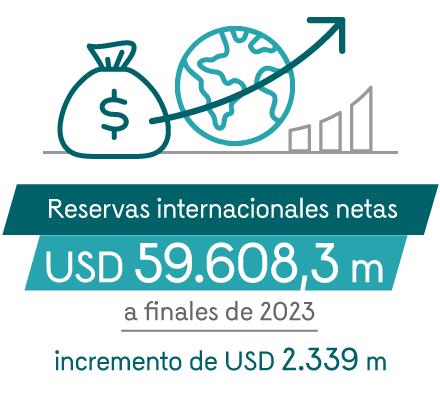 - Las reservas internacionales netas a finales de 2023 totalizaron USD 59.608,3 m, lo que significa un incremento de USD 2.339 m durante el año. El principal factor que explica este aumento corresponde a la causación de intereses recibidos por las inversiones. El rendimiento de las reservas internacionales durante 2023, excluyendo el componente cambiario, fue del 4 % (USD 2.355 m).
