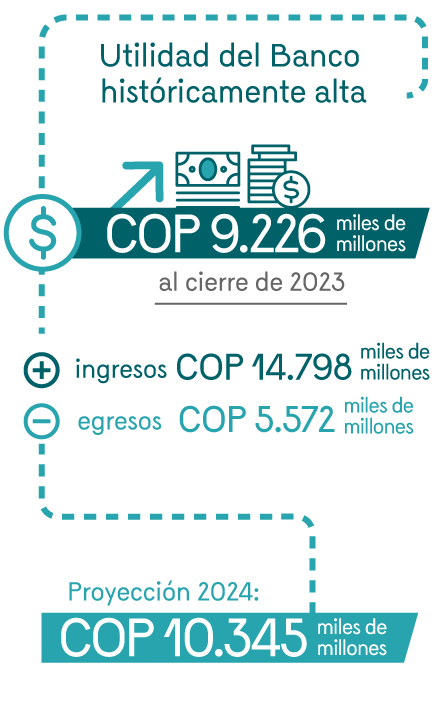- Al cierre de 2023, la utilidad del Banco fue históricamente alta y ascendió a COP 9.226 mm, como resultado de ingresos por COP 14.798 mm y de egresos por COP 5.572 mm.