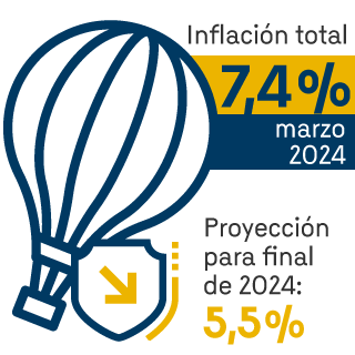 - En marzo la inflación total fue 7,4 % y completó un año de reducciones desde el máximo registrado un año atrás (13,3 %). En el primer trimestre de este año todos los principales componentes de la inflación cayeron (alimentos, servicios, bienes y regulados).