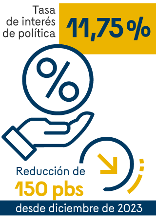 - En un contexto de disminución de la inflación y ajustes de algunos desbalances macroeconómicos, la Junta Directiva comenzó desde diciembre de 2023 a reducir la tasa de interés de política monetaria, acumulando 150 puntos básicos.