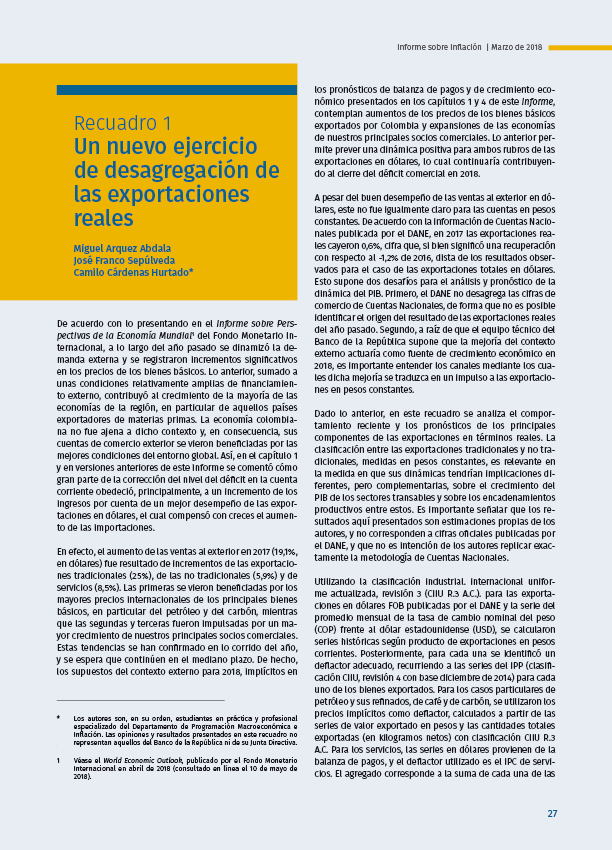 Los análisis y pronósticos incluidos en este informe son producidos por el equipo técnico del Banco. Es la base principal sobre la cual se realiza la recomendación de política monetaria a la Junta Directiva del Banco de la República (JDBR) y por estas razones no refleja necesariamente la opinión de sus miembros.
