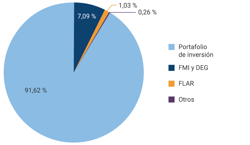El principal componente de las reservas internacionales es el portafolio de inversión, con el 91,62 % del total (USD 52.488,71 m). El saldo restante está distribuido entre la posición en el Fondo Monetario Internacional (FMI) y derechos especiales de giro (DEG), aportes al Fondo Latinoamericano de Reservas (FLAR) y otros.