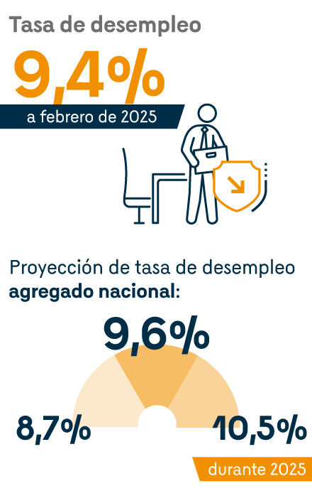 - Se espera que la tasa de desempleo urbana se ubique entre el 8,3 % y el 10,1 %, con un valor más probable del 9,2 % en promedio para 2025. Por su parte, esta tasa para el agregado nacional se proyecta entre el 8,7 % y el 10,5 %, siendo un 9,6 % la cifra más probable.