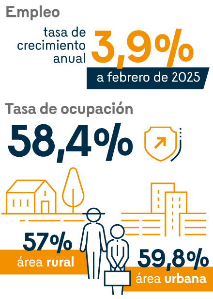 - A febrero del presente año, el empleo continuó creciendo a una tasa anual del 3,9 %, explicado, principalmente, por una mejor dinámica en el empleo rural, que creció a una tasa del 4,9 %.