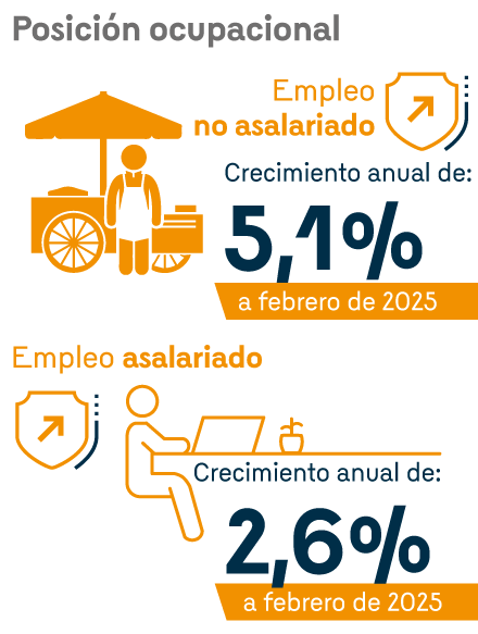 - Entre febrero de 2024 y 2025, el empleo no asalariado creció un 5,1 %, mientras que el asalariado aumentó un 2,6 %.