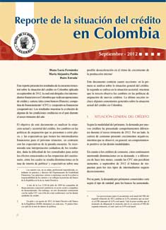 Este reporte presenta los resultados de la encuesta trimestral sobre la situación del crédito en Colombia (RSCC) aplicada en diciembre de 2012, la cual está dirigida a los intermediarios financieros en Colombia que realizan operaciones de crédito y cartera, tales como bancos (bancos), compañías de financiamiento (CFC) y cooperativas financieras (cooperativas). Los resultados muestran la evolución de algunas de las condiciones crediticias en el país durante el cuarto trimestre del año.