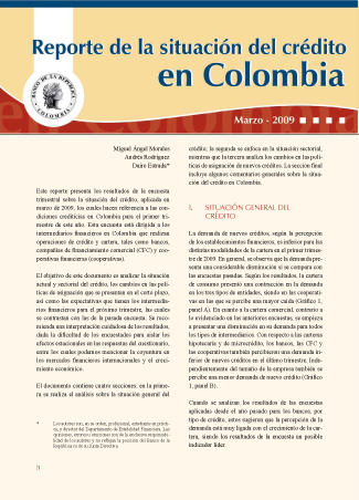 Este reporte presenta los resultados de la encuesta trimestral sobre la situación del crédito, aplicada en marzo de 2009, los cuales hacen referencia a las condiciones crediticias en Colombia para el primer trimestre de este año. Esta encuesta está dirigida a los intermediarios financieros en Colombia que realizan operaciones de crédito y cartera, tales como bancos, compañías de financiamiento comercial (CFC) y cooperativas financieras (cooperativas).