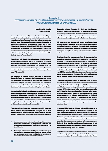 La reciente caída en los términos de intercambio del país afectó de forma importante el crecimiento económico. Este recuadro analiza qué sucedería con el crecimiento sostenible de largo plazo si esta caída fuese permanente. Lo anterior es de especial importancia si se tiene en cuenta que la Junta Directiva del Banco de la República (JDBR) tiene el mandato constitucional de mantener una inflación baja y estable, en coordinación con una política económica que propenda por estabilizar el producto y el empleo en sus niveles sostenibles de largo plazo o “potenciales”.