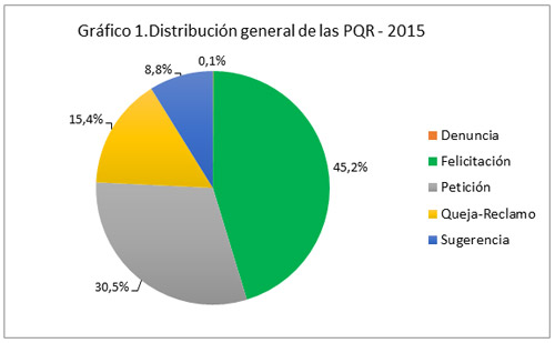 En la vigencia 2015, el Banco recibió un total de 9.637 solicitudes, de las cuales 45.2% corresponden a felicitaciones, 30,5% a peticiones y 15,4% a quejas y reclamos; estos tres tipos de solicitudes son las de mayor participación con respecto al total. Lo anterior se presenta en el gráfico 1