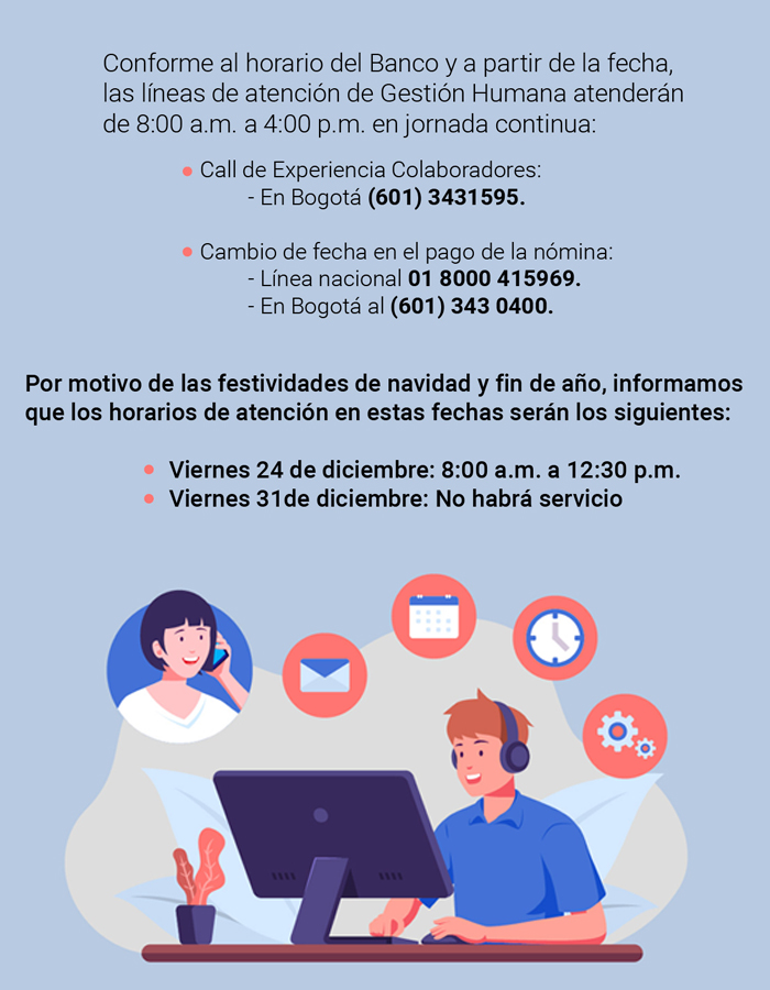 - En Sucursales: Áreas de Gestión Humana: A través del sistema de Audiorespuesta: 24 horas al día, todos los días del año